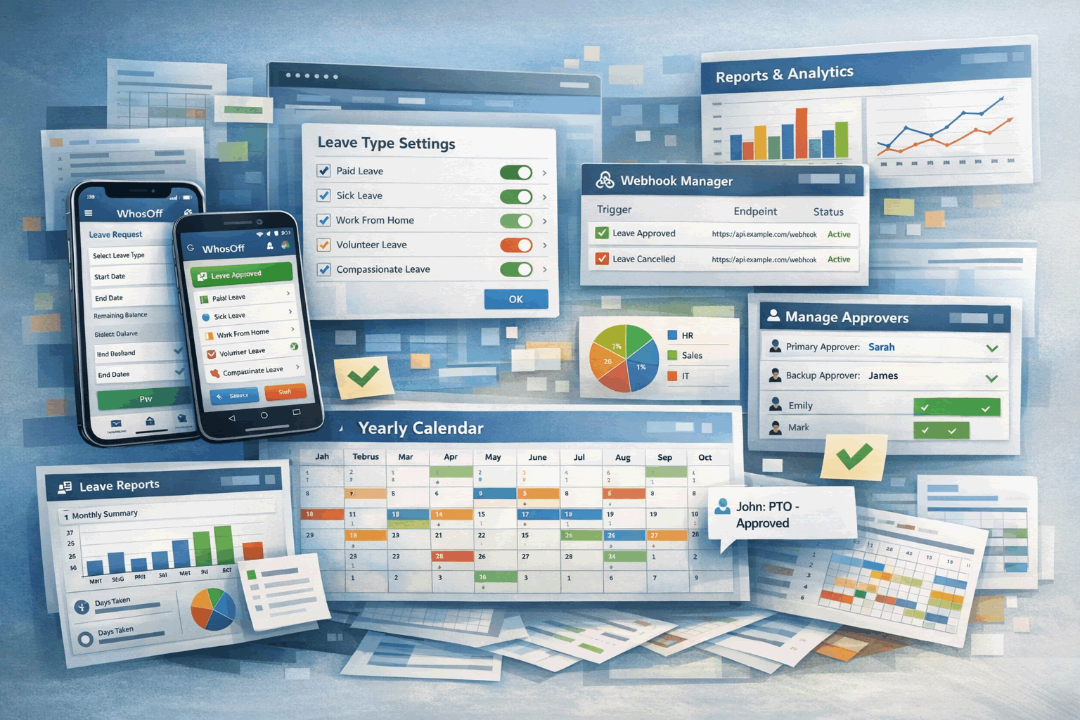 The latest WhosOff platform updates tackle these challenges directly, bringing a rebuilt visual yearly calendar for individuals, 2nd and 3rd approver options, clearer cross-year booking displays, expanded reporting, minimum duration settings for leave types, and a new webhook service for connecting to external systems.